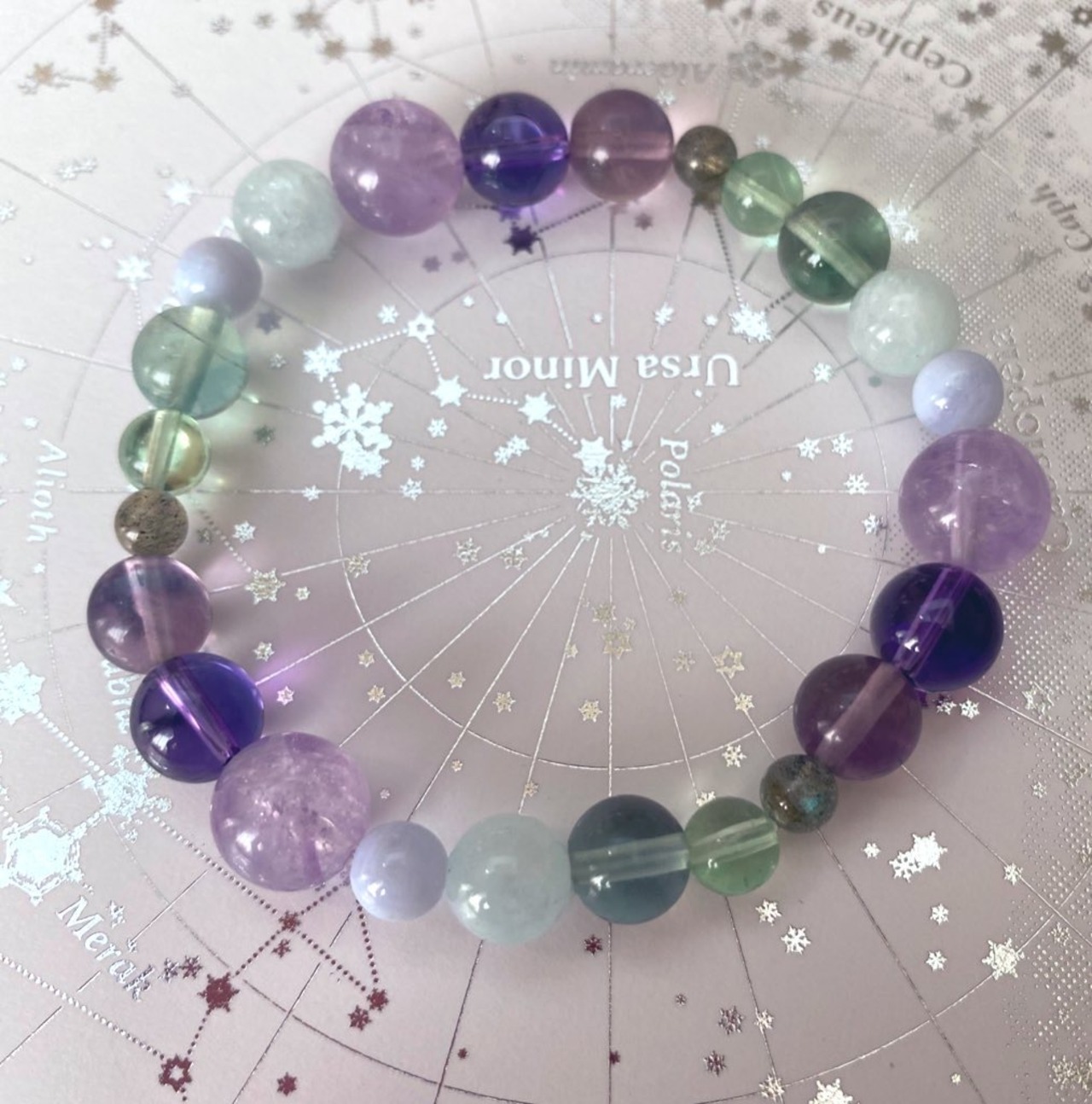 紫陽花のイメージで天然石を繋ぎ、ブレスレットにしました。1点もの。