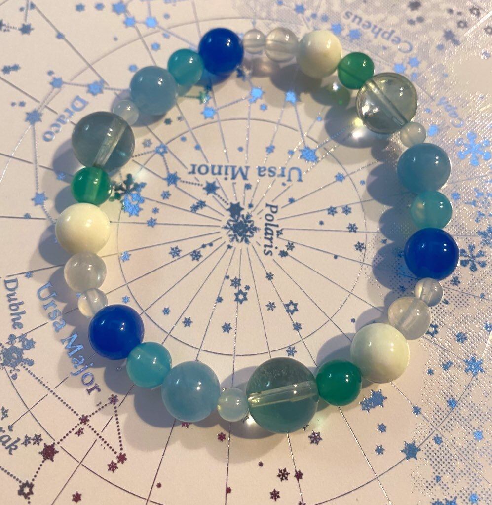 瑠璃唐草(ネモフィラ)のイメージで天然石を繋ぎ、ブレスレットにしました。